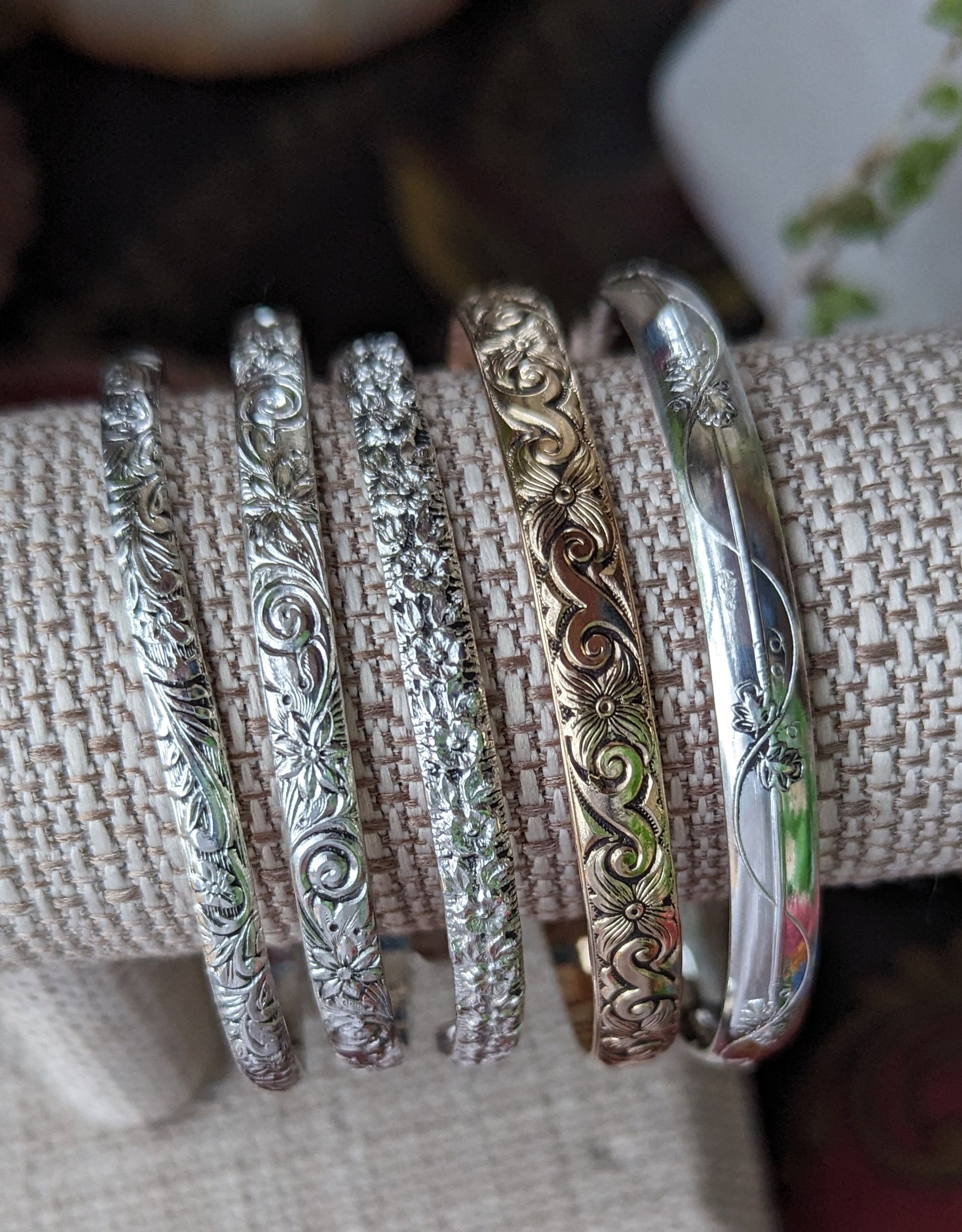Floral pattern cuff bracelet available in sterling silver or 14k gold filled.
