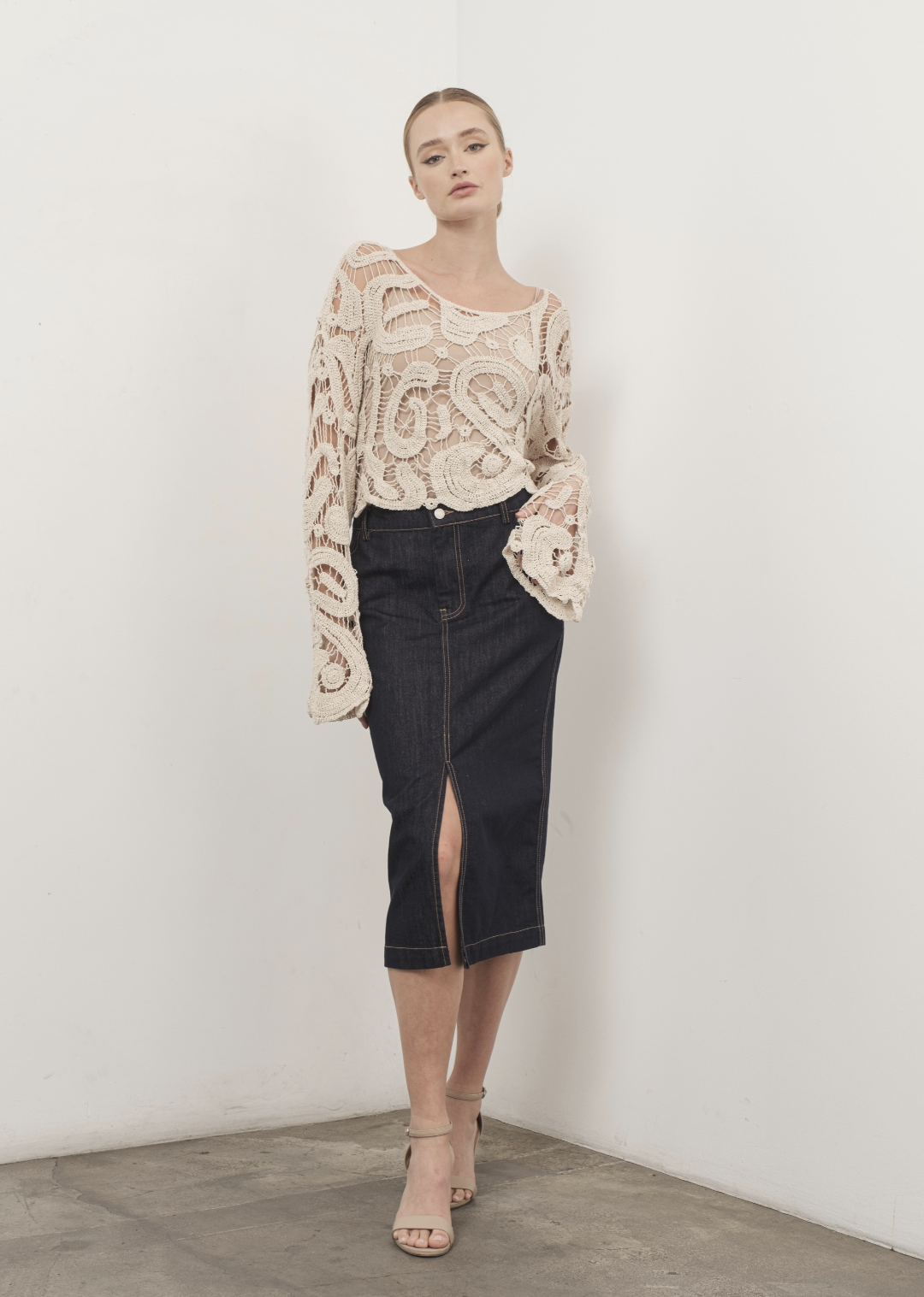 "Effortlessly add a touch of romance to your wardrobe with this crochet top. The open weave design allows for easy layering, while the bell sleeves and oversized fit add a fun and playful touch. Perfect for any occasion, this top is a must-have for any fashion-forward individual."