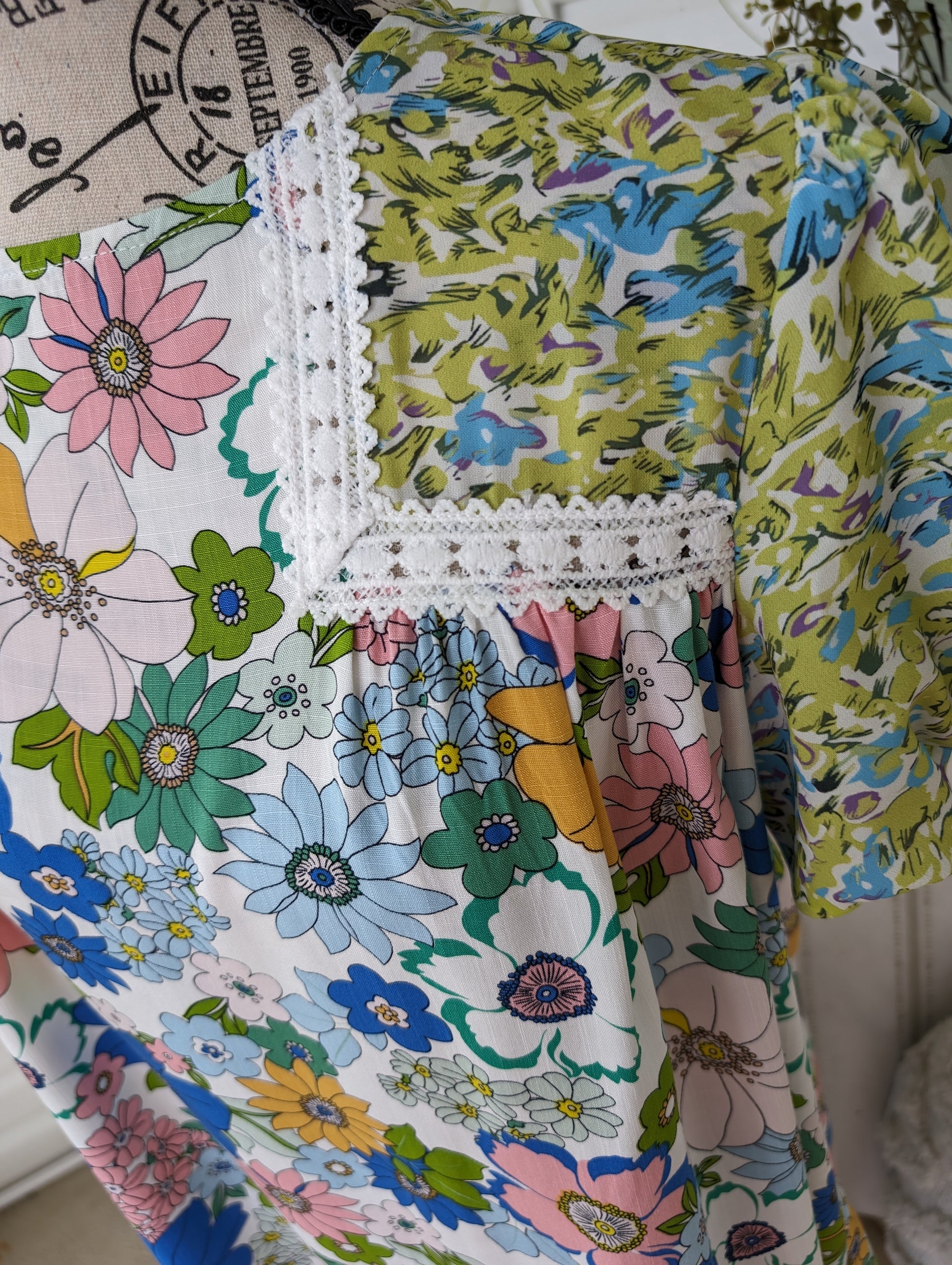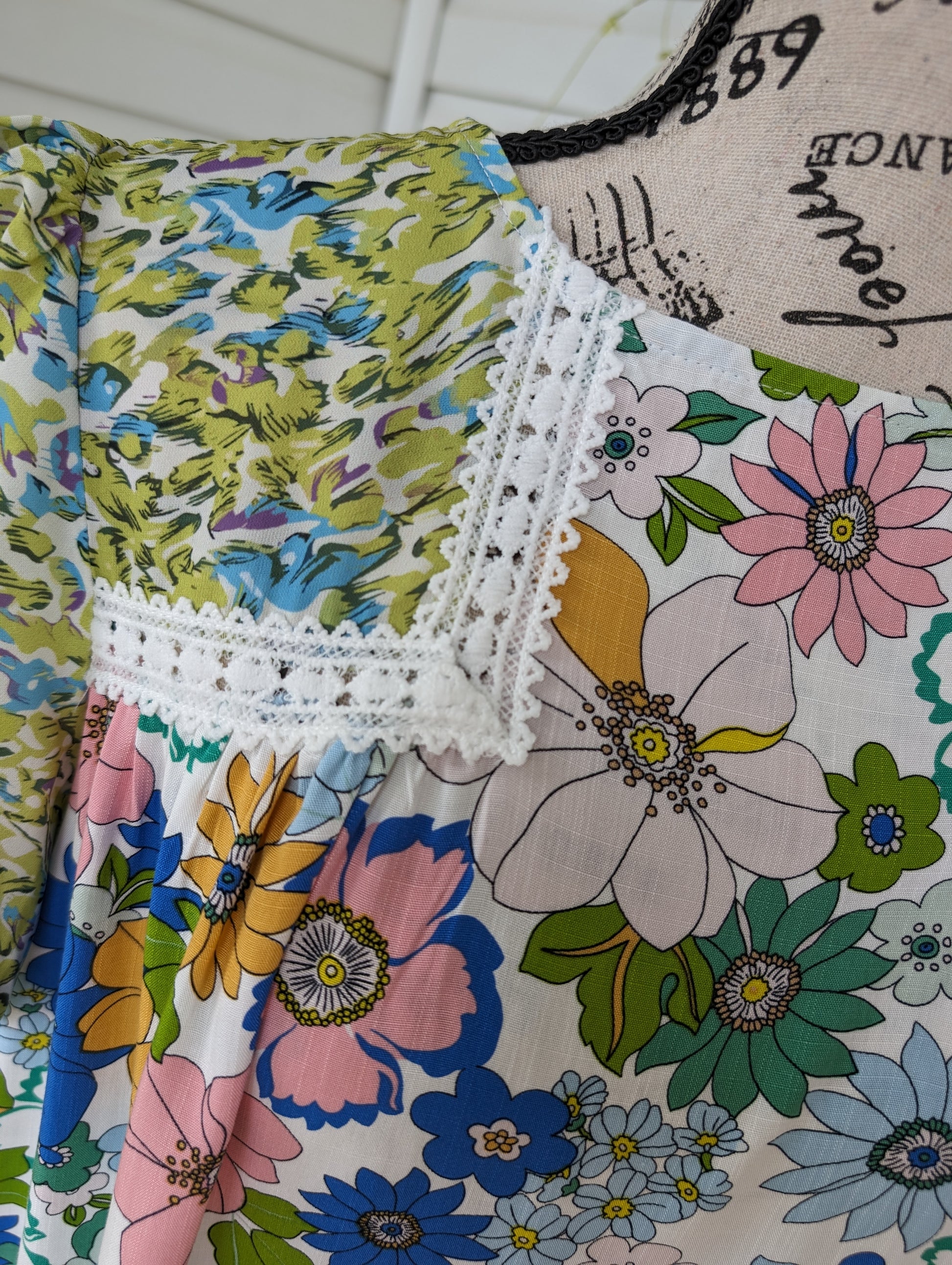 This floral lace trim top features a beautiful blend of blues, greens, and pinks for a vibrant and eye-catching look. The delicate crochet trim adds a touch of elegance, while the short balloon sleeves provide a trendy and flattering silhouette. Stay stylish and comfortable in this must-have piece.