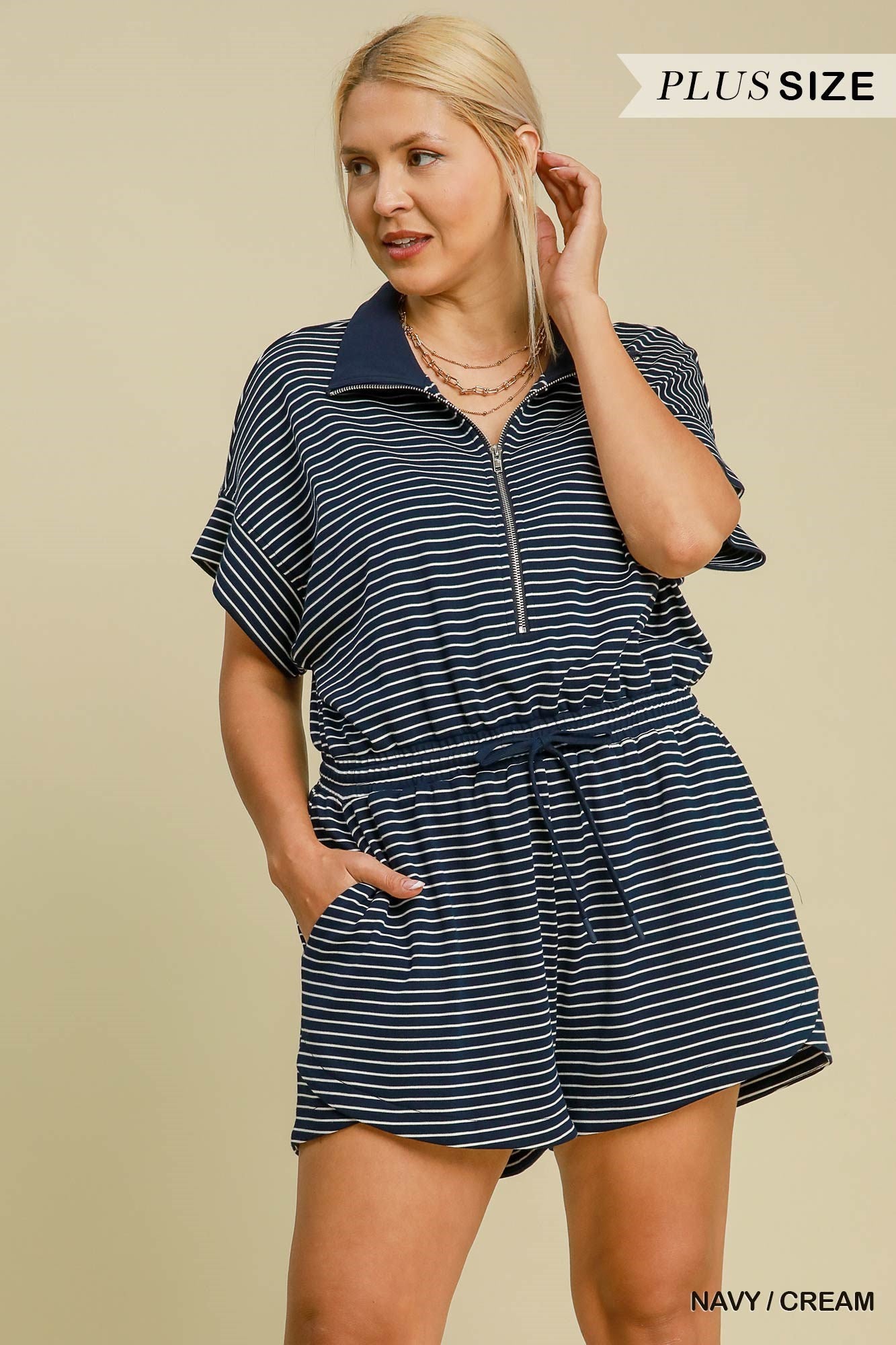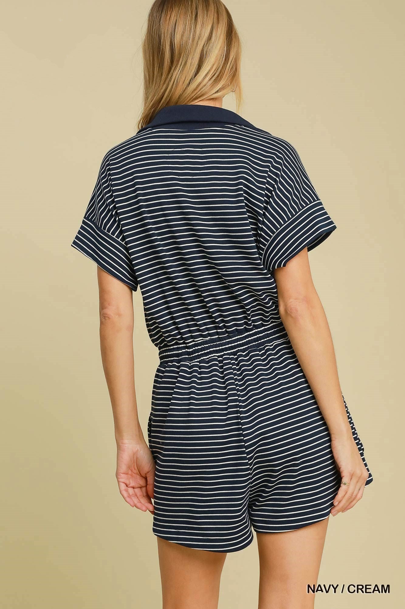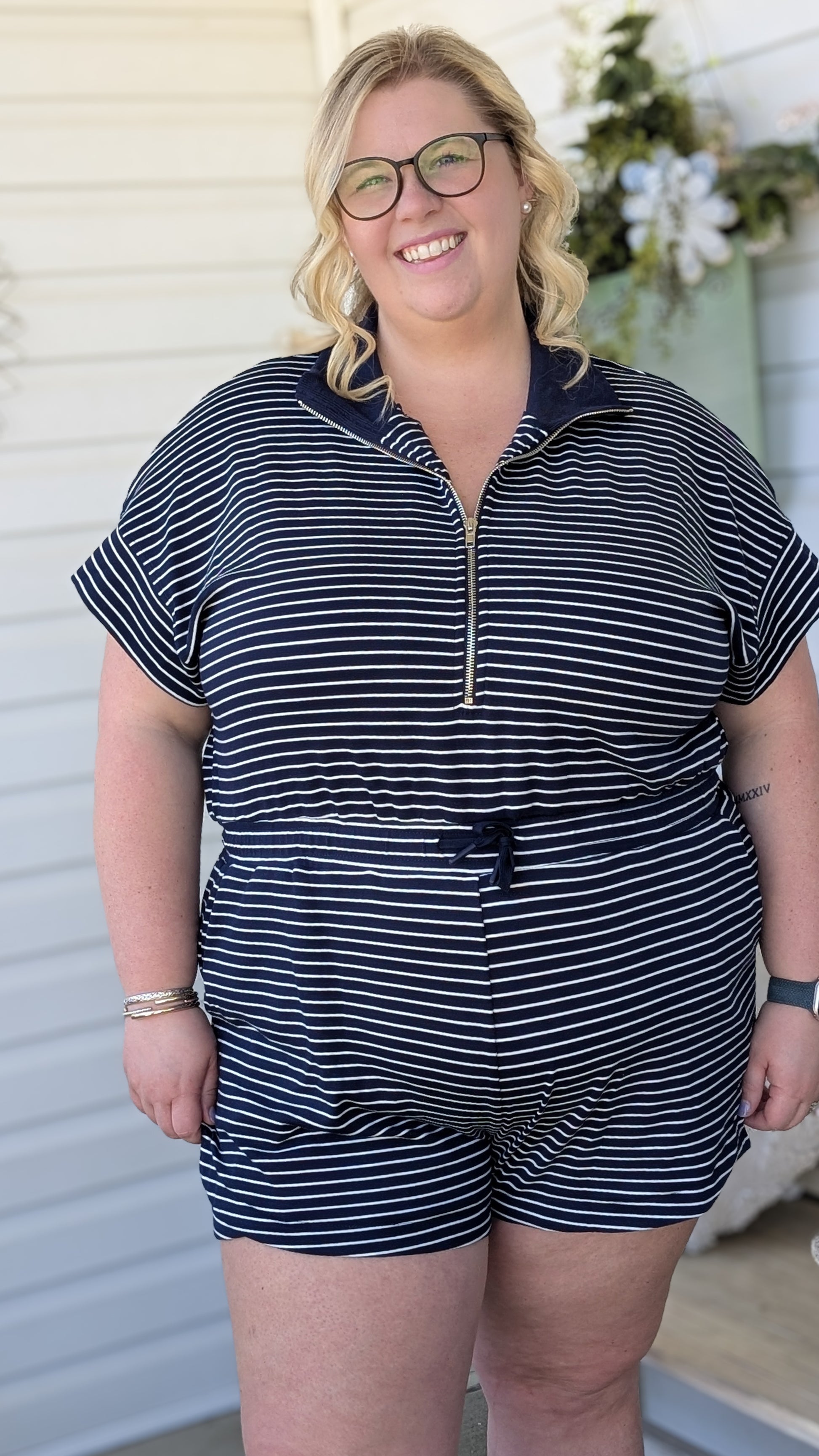 Introducing our Navy Knit Striped Romper - the perfect combination of comfort and style. Made with a soft, knit material and featuring an adjustable tie waist, this romper is both comfortable and flattering. The convenient half zip allows for easy on and off. Stay on trend with our Striped Romper.