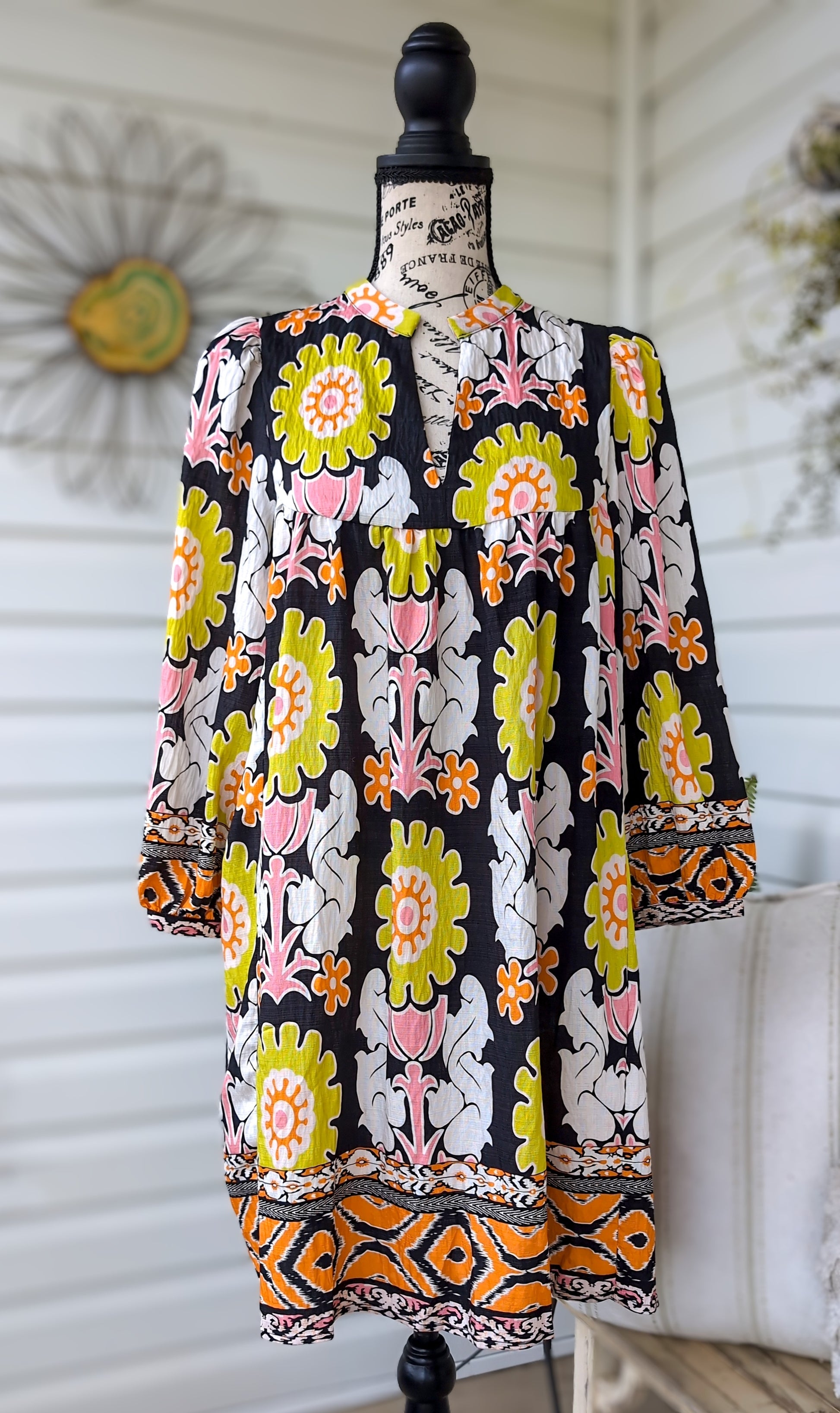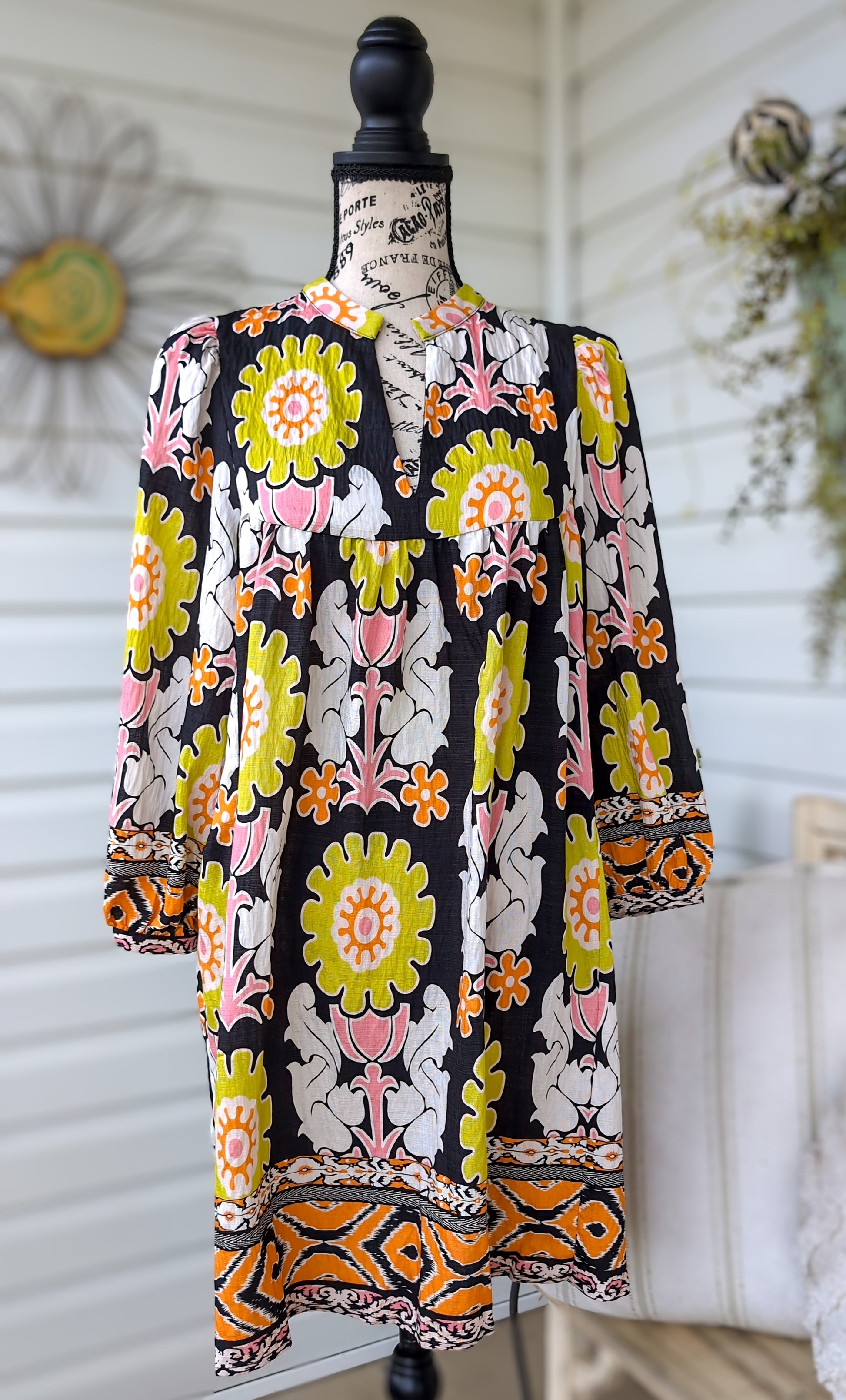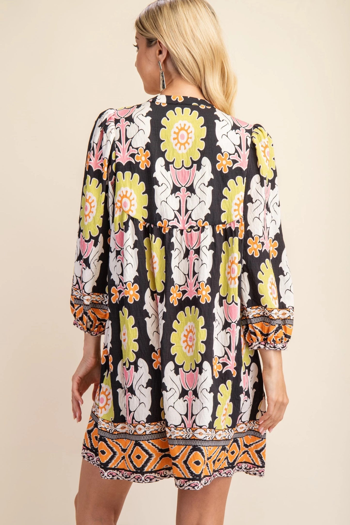 Introducing our Perfect Mini Dress - a versatile addition to your wardrobe! With a flattering loose fit, v-neck, and fabric covered button on the sleeves, this dress is perfect for any occasion. Dress it up or down with its bold, fun colors and just the right length. The perfect combination of style and comfort.