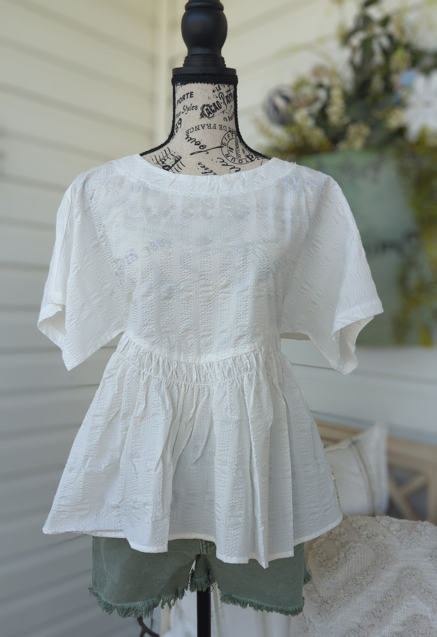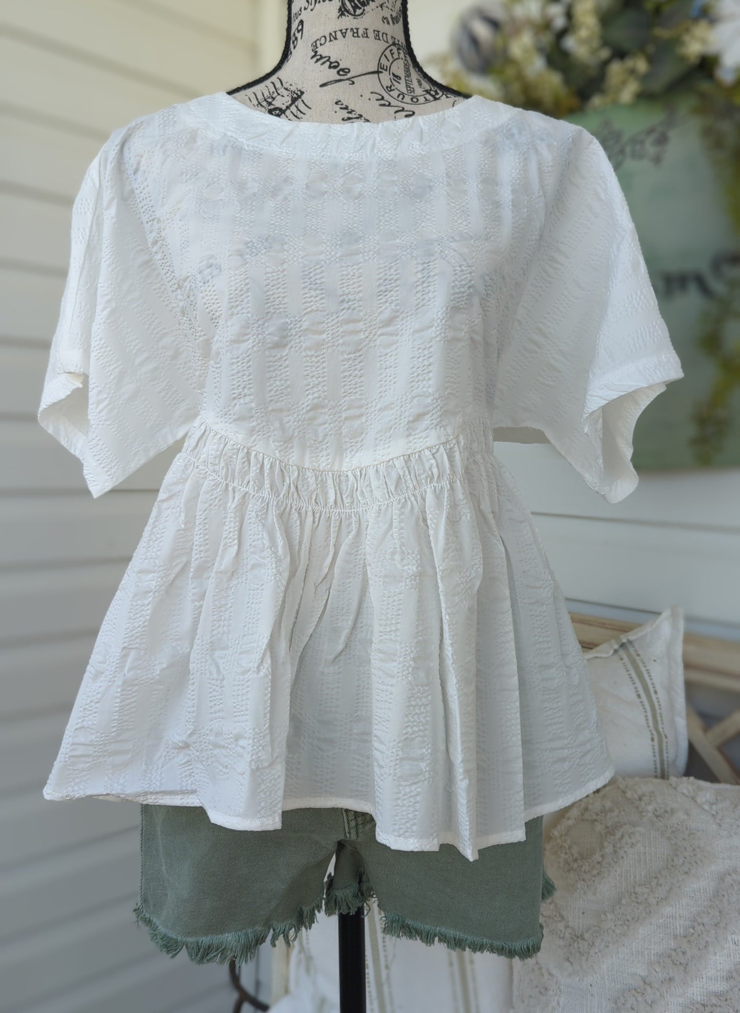 This round neck textured top features a cinched waist with an A-line look, giving it a flattering and stylish silhouette. Shop now and elevate your wardrobe with this trendy piece.